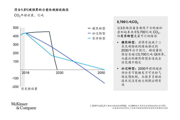 要實現(xiàn)這一目標(biāo),就必須根本性地改變現(xiàn)狀,迅速地以空前幅度減少二氧化碳、甲烷、一氧化氮等諸多溫室氣體排放。為應(yīng)對時代危機,麥肯錫全球可持續(xù)發(fā)展研究團隊歷時兩年打造了以將全球升溫控制在1.5℃以內(nèi)為目標(biāo)的減碳路徑模型,并得出至2050年全球二氧化碳排放量需控制在5,700億噸以內(nèi)的結(jié)論。在各轉(zhuǎn)型路徑中,我們認為最可行的當(dāng)屬未來十年減排速度較快的“有序轉(zhuǎn)型”路徑,這意味著截至2030年全球需減少50%~55%的排放量,破局就在未來十年。