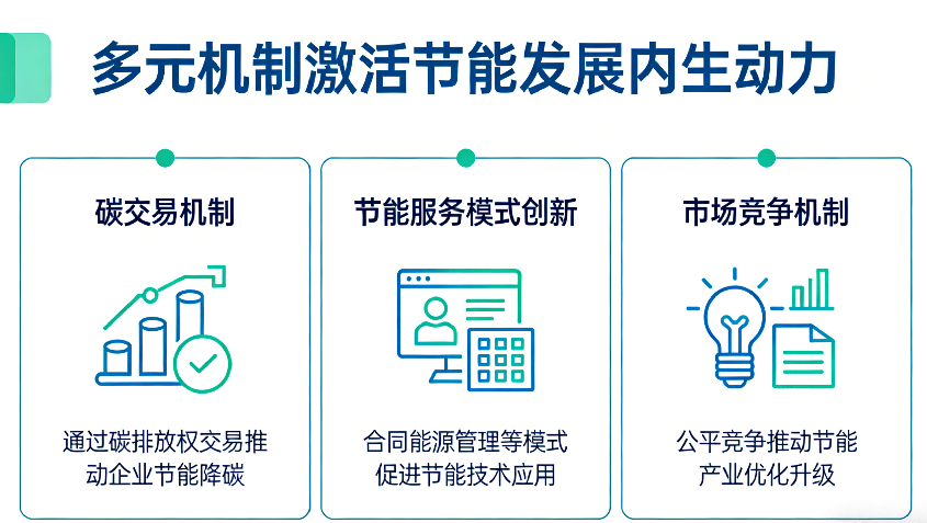 市場(chǎng)作為節(jié)能雙輪驅(qū)動(dòng)體系中的 “效率引擎”,通過構(gòu)建可量化、可交易、可持續(xù)的多元機(jī)制,將節(jié)能從政策要求轉(zhuǎn)化為市場(chǎng)選擇,推動(dòng)節(jié)能工作從"要我省"向"我要省"轉(zhuǎn)變。