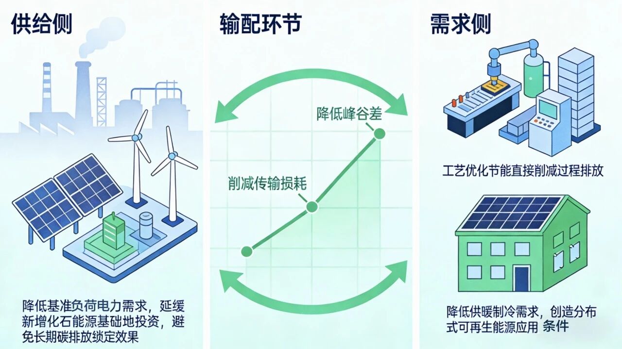 從全生命周期視角看,節(jié)能的碳減排效益貫穿能源系統(tǒng)各個環(huán)節(jié)。在供給側(cè),節(jié)能降低了基準(zhǔn)負(fù)荷電力需求,延緩了新建化石能源基礎(chǔ)設(shè)施的投資需求,避免了長期碳排放鎖定效應(yīng);在輸配環(huán)節(jié),通過降低峰谷差和總用電量,削減電網(wǎng)傳輸損耗,從而降低單位電量碳排放強度;在需求側(cè),工業(yè)系統(tǒng)通過工藝優(yōu)化節(jié)能直接削減過程排放,建筑節(jié)能則不僅降低供暖制冷需求,還為分布式可再生能源的應(yīng)用創(chuàng)造了有利條件。