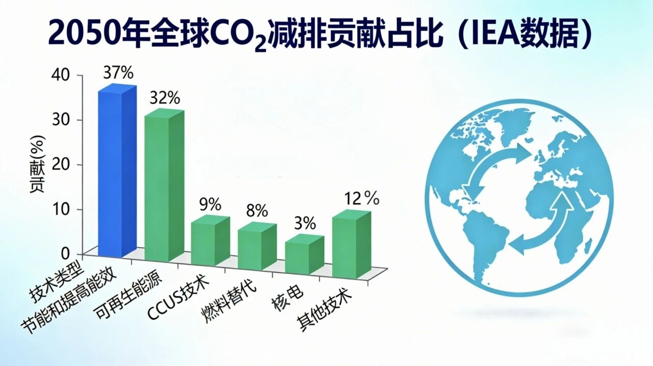 謝克昌院士最早于2022年11月在《什么是實現(xiàn)“碳達(dá)峰、碳中和”最直接、最有效、最經(jīng)濟(jì)的手段?》專題演講中明確指出:“相比拓展二氧化碳資源化利用途徑,節(jié)能提效才是實現(xiàn)碳達(dá)峰、碳中和的第一優(yōu)選。我國單位GDP能耗是世界平均水平的1.4-1.5倍(根據(jù)最新2024年數(shù)據(jù)為1.3倍),若達(dá)世界均值,年均可減排34億噸CO?,占2020年全國碳排放總量的三分之一。” 國際能源署的分析進(jìn)一步印證了節(jié)能的全局價值:如果全球溫室氣體排放從目前的330億噸下降到2050年的100億噸左右,則2050年前節(jié)能和提高能效對全球二氧化碳減排的貢獻(xiàn)為37%,發(fā)展可再生能源貢獻(xiàn)為32%,燃料替代貢獻(xiàn)為8%,發(fā)展核電貢獻(xiàn)為3%,CCUS技術(shù)貢獻(xiàn)為9%,還有12%貢獻(xiàn)由其他技術(shù)滿足。可見2050年之前,節(jié)能和提高能效,被視為全球能源系統(tǒng)二氧化碳減排的最主要途徑。
