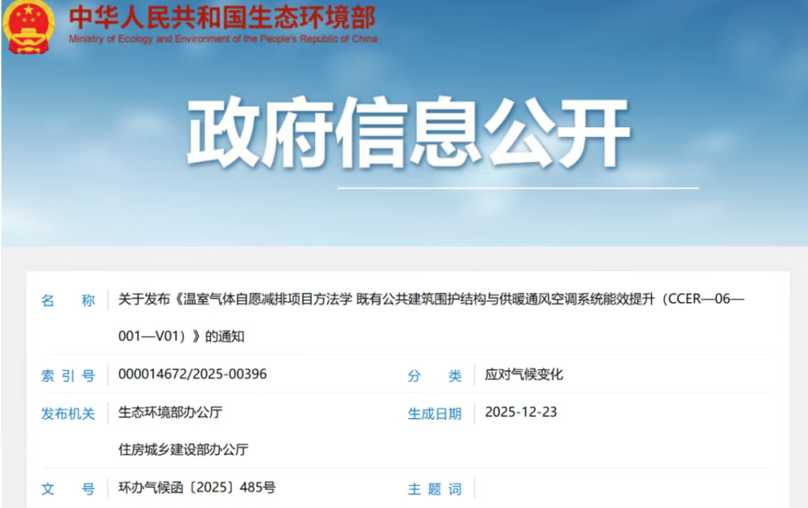 2025年12月生態(tài)環(huán)境部發(fā)布了建筑領(lǐng)域首個 CCER 方法學(xué)——《既有公共建筑圍護結(jié)構(gòu)與供暖通風(fēng)空調(diào)系統(tǒng)能效提升(CCER—06—001—V01)》