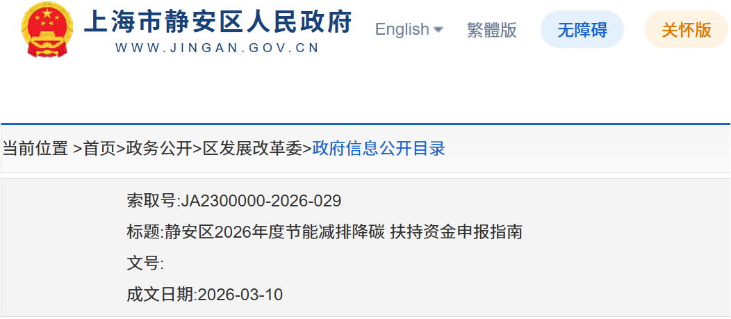 2026年3月上海市靜安區(qū)政府發(fā)布了《靜安區(qū)2026年度節(jié)能減排降碳扶持資金申報指南》(簡稱《指南》)。