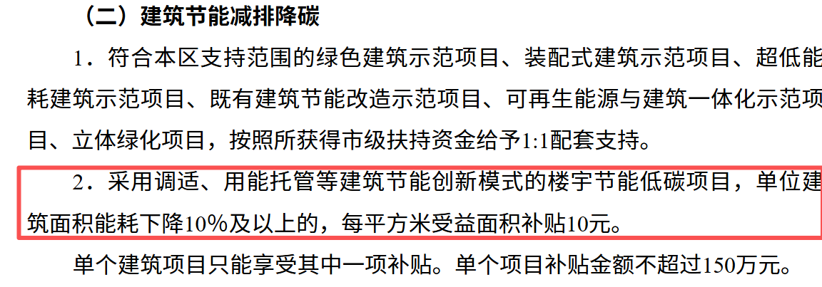《指南》明確指出綠色建筑、超低能耗建筑、既有建筑節(jié)能改造等項目,按所獲市級扶持資金 1:1 配套支持;采用調(diào)適、用能托管等創(chuàng)新模式的樓宇節(jié)能低碳項目,單位建筑面積能耗下降10%及以上的,按10元/平方米受益面積給予補貼。