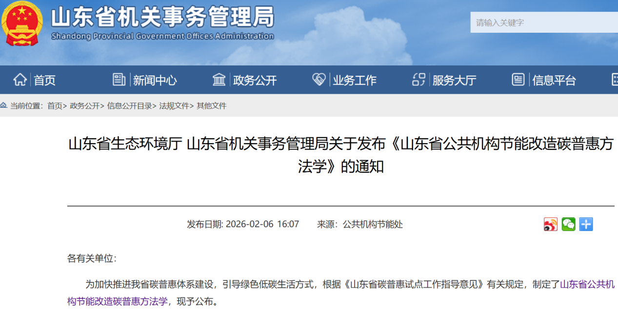 2026年2月山東省生態(tài)環(huán)境廳、山東省機關(guān)事務(wù)管理局聯(lián)合發(fā)布了《山東省公共機構(gòu)節(jié)能改造碳普惠方法學(xué)》。
