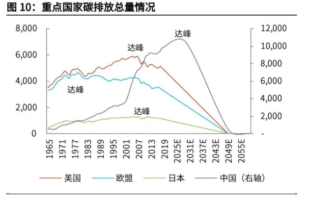 為什么“新冠疫情”后,我國推動“碳中和”更加迅速?——增加國際聲譽和話 語權(quán)。2019 年我國碳排放量達(dá) 98.26 億噸位列全球第一(人均碳排放和碳排放 量/GDP 均相對較低),自 2005 年以來為全球碳排放總量最高的國家(加入世 貿(mào)組織后,全球產(chǎn)業(yè)鏈分工變化所致)。近年來我國碳排放增速已有所放緩,但 較為龐大的人口基數(shù)使得我國碳排放全球占比仍在持續(xù)提升,2019 年達(dá) 28.76%。而針對“新冠疫情”源頭問題,經(jīng)常有部分西方國家和人員因政治原因公開抹黑 中國。而加速推動“碳中和”將助力我國樹立負(fù)責(zé)任的大國形象,在國際氣候法 律秩序構(gòu)建中爭取獲得“話語權(quán)”,并掌握未來全球“游戲規(guī)則”的主動權(quán)和制 定權(quán)。目前,全人類氣候目標(biāo)競賽已經(jīng)開啟,根據(jù) EnergyClimate 機構(gòu)推出的凈零排 放競賽計分卡,目前我國已處于第四梯隊,位列全球第 28 位。3)“碳中和”的統(tǒng)一性:全球難得的政策與利益一致點從全球來看,多數(shù)國家已更新 NDC(國家自主貢獻(xiàn))目標(biāo)。“碳中和”已成為 全球大趨勢。拜登上臺后,美國重新加入《巴黎協(xié)定》,應(yīng)對氣候變化是拜登此次總統(tǒng)競選的 核心承諾之一,未來美國將在全球氣候變化、新能源發(fā)展方面采取更多的措施。雖然前期中美在貿(mào)易和技術(shù)層面有著種種的不愉快,但是在應(yīng)對全球氣候變化方 面,無論是中美還是全球,在碳中和方面,具有相同的利益和方向。盡管全球越來越多的政府正在將碳中和目標(biāo)納入國家戰(zhàn)略,但就具體目標(biāo)而言, 仍有區(qū)別。如歐盟在 2020 年 3 月提交《氣候中性法》,旨在從法律層面確保歐洲到2050 年成為首個“氣候中性”大陸。美國加州和中國分別制定了 2045 年 和 2060 年“碳中和”目標(biāo)。加州的目標(biāo)包括削減所有溫室氣體排放,包括二氧 化碳、甲烷等,并抵消其無法削減的排放量,而中國的目標(biāo)僅針對二氧化碳。我國碳排放下降斜率更大。由于發(fā)展階段的不同,發(fā)達(dá)國家已普遍經(jīng)歷“碳達(dá)峰”, 為達(dá)到 2050 年“碳中和”,更大程度上只是延續(xù)以往的減排斜率。而我國碳排 放總量仍在增加,需要經(jīng)歷 2030 年前“碳達(dá)峰”,然后走向 2060 年前“碳中 和”。從實現(xiàn)“碳中和”的年限來看,比發(fā)達(dá)國家時間更緊迫,碳排放下降的斜 率更大。