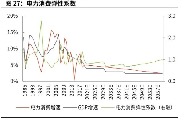 在“碳達(dá)峰”、“碳中和”目標(biāo)的倒逼之下,“能耗指標(biāo)”將成為重要的抓手, 2021 年全球經(jīng)濟復(fù)蘇,大宗商品價格上漲動力較強,疊加“碳中和”目標(biāo)下的 產(chǎn)能壓降手段,高能耗產(chǎn)品供給側(cè)約束后,價格有可能進(jìn)一步提升。我們根據(jù)能耗指標(biāo),梳理了高耗能類型產(chǎn)品:電解鋁、硅鐵、電爐錳鐵、石墨電 極、燒堿、滌綸、銅等,都有可能成為限制對象。現(xiàn)有的能源系統(tǒng)中,煤、石油是主要力量。據(jù)統(tǒng)計年鑒數(shù)據(jù),2019 年我國能源 消費總量 48.7 億噸標(biāo)煤,其中煤炭、石油、天然氣、一次電力及其他能源占比 分別為 57.7%、18.9%、8.1%、15.3%。從用途來看,石油主要用于終端消費(交通、工業(yè)),煤炭主要用于中間消費(火 力發(fā)電),天然氣主要用于終端消費(交通、工業(yè)、建筑部門)。回顧人類對能源利用的探索歷程,實際上是從利用核外電子到利用核內(nèi)電子的過 程,但這恰是宇宙、物質(zhì)、能源發(fā)展的逆過程。二次能源中,對電能的利用是一項偉大的革命,現(xiàn)已成為能源利用的樞紐,從歷 史上看,“電”也引發(fā)了多次生產(chǎn)技術(shù)革命。而氫能同作為二次能源,具有可存 儲的優(yōu)勢,但也因制備和使用效率稍遜而經(jīng)濟性較差,但從能量循環(huán)的角度看, 可以有助于碳的減排。鋰、氫能同作為可行且具有前景電子存儲載體,其重要的原理特點在于,Li+與 H2 都是小粒子,有助于提升物質(zhì)/能源轉(zhuǎn)換便利性。碳中和的最重要目的就是減少含碳溫室氣體的排放,采用合適的技術(shù)固碳,最終 達(dá)到平衡。為達(dá)到碳中和,我們預(yù)計到 2060 年,清潔電力將成為能源系統(tǒng)的配置中樞。供 給側(cè)以光伏+風(fēng)電為主,輔以核電、水電、生物質(zhì)發(fā)電;需求側(cè)全面電動化,并 輔以氫能。2.2.1、能源供給側(cè):可再生能源主導(dǎo)(1)我們采用“自上而下”的測算方法,假設(shè)未來 GDP 增速和發(fā)電量增速從“十 三五”末期的 5%逐步下降到 2.5%;而由于節(jié)能降耗的原因,未來單位 GDP 能 耗逐步下降,電力消費彈性系數(shù)將小于 1。(2)假設(shè)未來我國總發(fā)電量和 GDP 保持同步增長態(tài)勢且增速一致,假設(shè) GDP 和總發(fā)電量增速分別為 2021-2030 年 4%、2031-2040 年 3%、2041-2060 年 2.5%。