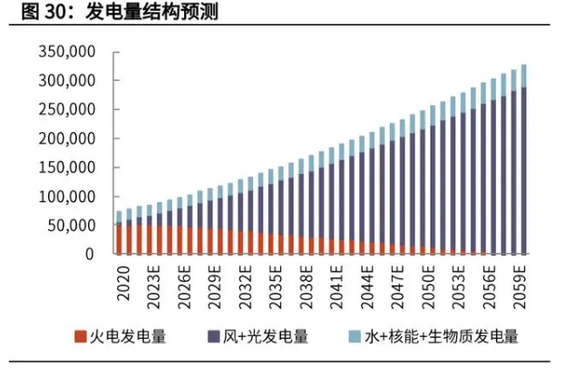 根據(jù)我們的上述假設(shè),以 2019 年發(fā)電量 7.22 萬億千瓦時為基礎(chǔ),2030 年發(fā)電 量達(dá)到 11.9 萬億千瓦時(和部分機構(gòu)的預(yù)測數(shù)據(jù)基本一致),2060 年發(fā)電量進(jìn)一步達(dá)到 32.71 萬億千瓦時。在總發(fā)電量預(yù)測的基礎(chǔ)上,我們將進(jìn)一步對不同發(fā)電方式未來的發(fā)電量及相應(yīng)的 裝機需求進(jìn)行拆分。(1)火電:裝機量方面,在 2030 年碳達(dá)峰基礎(chǔ)上,在經(jīng)濟發(fā)展的過程中 2020-2030 年仍需要有一定規(guī)模的火電裝機支撐發(fā)電量增長,因此我們假設(shè)火電 裝機在 2020-2030 年間每年仍將維持增長態(tài)勢,但增量逐步減少直至 2030 年無 新增火電裝機;2030-2060 年,火電裝機每年將逐步退出電力市場,直至 2060 年碳中和時存量火電裝機清零。利用小時數(shù)方面,隨著火電裝機的逐步減少,未 來火電將更多用于調(diào)峰平抑發(fā)電曲線,因此我們假設(shè)火電利用小時數(shù)從 2020 年 的 4080 小時逐步降低至 2030 年的 3080 小時,后續(xù)則保持平穩(wěn)。發(fā)電量方面, 在裝機量和利用小時數(shù)假設(shè)的基礎(chǔ)上,火電的發(fā)電量占比將從 2020 年的 68%逐 步減少至 2060 年碳達(dá)峰時的 0%。(2)水+核能+生物質(zhì):假設(shè)未來水+核能+生物質(zhì)整體的發(fā)電量情況保持穩(wěn)定, 2020-2060 年,在 1.7 萬億千瓦時的基礎(chǔ)上每年增長 2%。(3)光伏+風(fēng)電:在火電發(fā)電量逐步減少,水+核能+生物質(zhì)發(fā)電量保持相對穩(wěn) 健增長的背景下,光伏和風(fēng)力發(fā)電將逐步成為未來最重要的發(fā)電方式。發(fā)電量占 比方面,我們假設(shè)光伏+風(fēng)電發(fā)電量中光伏發(fā)電的占比維持在 40%;利用小時數(shù) 方面,假設(shè)風(fēng)電、光伏年利用小時數(shù)分別維持在 2400h、1300h;裝機量方面, 在總發(fā)電量發(fā)展、其他發(fā)電方式發(fā)電量、光伏發(fā)電量占比、以及光伏和風(fēng)電利用 小時數(shù)等預(yù)測的基礎(chǔ)上,我們測算得出2030年風(fēng)電、光伏新增裝機量分別為1.53、 1.88 億千瓦,2060 年風(fēng)電、光伏新增裝機量進(jìn)一步達(dá)到為 2.19、2.7 億千瓦。(4)儲能:由于光伏、風(fēng)電的不穩(wěn)定性,必須輔以必要的儲能以平抑發(fā)電波動。假設(shè)儲能容配比從 2020 年的 10%逐步提升至 2060 年的 100%,備電時長從 2020 年的 2h 逐步提升至 2060 年的 4h,則儲能每年的新增容量將從 2020 年的 0.24 億千瓦時增長至 2060 年的 19.55 億千瓦時。需要注意的是,我們對光伏、風(fēng)電新增裝機量的預(yù)測源自對部分關(guān)鍵變量的核心 假設(shè),如果其未來發(fā)生變化(如火電利用小時降低超預(yù)期、水+核能+生物質(zhì)發(fā) 電量降低、儲能配套設(shè)施建設(shè)超預(yù)期等),則未來光伏、風(fēng)電每年的新增裝機量 或?qū)⒊A(yù)期增長。