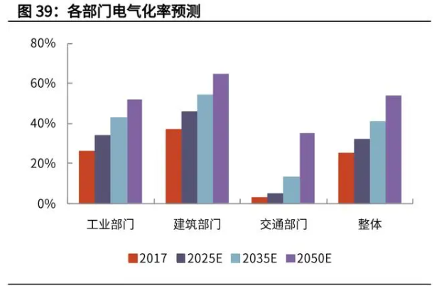 由于能源供給側(cè)向綠色電力轉(zhuǎn)變,所以需求側(cè)的脫碳首先意味著終端電氣化。根據(jù)國網(wǎng)能源研究院 2019 年 12 月的研究成果,終端電氣化率在 2050 年達(dá)到 50%以上,其中工業(yè)、建筑、交通部門分別達(dá)到 52%、65%、35%。
