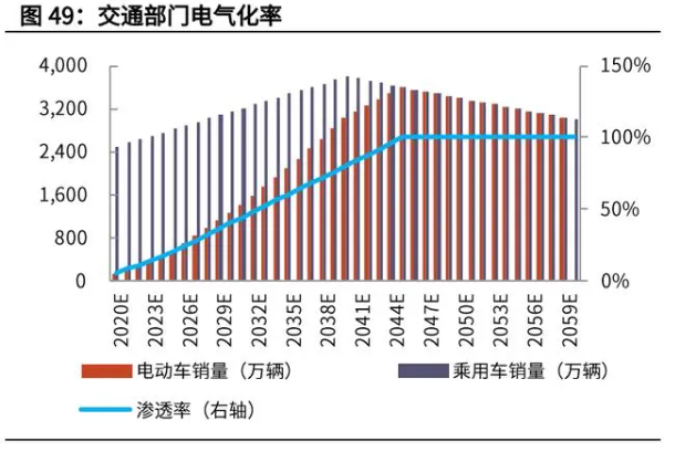 鋼鐵、電解鋁、水泥等行業(yè)是能耗大戶,也是碳排放大戶。鋼鐵行業(yè)的電氣化路徑主要是從高爐轉(zhuǎn)向電爐,電爐及其設(shè)備、耗材仍具有較好 的投資機會。根據(jù)鋼協(xié)數(shù)據(jù),2019 年我國鋼鐵行業(yè) 90%以上的產(chǎn)能采用高爐 (BOF)技術(shù),而電爐技術(shù)(EAF)僅占生產(chǎn)總量的 9%。特別是以廢鋼為原料 的短流程煉鋼技術(shù),碳排放量僅 0.4 噸二氧化碳/噸鋼,若使用綠色電力為電爐 供能,則碳排放量可降為 0。水泥的生產(chǎn)過程中需要將水泥窯加熱到 1600 攝氏度以上,目前電爐的使用尚未 商業(yè)化,投資成本較高。目前較為可行的方法是用沼氣、生物質(zhì)替代化石燃料。從建筑屬性來看,可以分為公共建筑、城鎮(zhèn)居民建筑和農(nóng)村居民建筑。從用途來 看,供熱、制冷、烹飪是中國建筑部門的主要能源消費來源。建筑部門的電氣化 率仍較低,2017 年僅為 28%。目前,制冷、照明、家電已經(jīng)實現(xiàn)了 100%電氣化,供暖和烹飪的電氣化推進(jìn)較 為緩慢。我國北方城鎮(zhèn)普遍實行集中供暖,主要熱源為燃煤熱電聯(lián)產(chǎn)和燃煤鍋爐。自 2017 年以來,我國北方地區(qū)推行“煤改氣”、“煤改電”,對建筑部門的電 氣化有一定的推動作用。炊事方面,根據(jù)清華大學(xué)建筑電氣化接受程度調(diào)研,一方面,住宅炊事用能逐漸 向公建轉(zhuǎn)移,應(yīng)關(guān)注公建餐廳電氣化;另一方面,住宅炊事電氣化最大難點在于 改變用戶習(xí)慣。總之,建筑部門電氣化需綜合考慮公共部門與居民住宅,也要考慮南北方氣候差 異。隨著人民生活水平提高,家用電器的數(shù)量和使用強度呈上升趨勢。未來采暖 電氣化應(yīng)逐步替代燃煤鍋爐,炊事電氣化應(yīng)重點關(guān)注餐廳電氣化和住宅炊事習(xí)慣 引導(dǎo)。1)道路交通(小型、輕型):綠色電力為基礎(chǔ)的電動車(電池),配套充電樁、換電站;2)道路交通(重型)、鐵路或海運:氫能(或氨氣),配套加氫站;我們預(yù)計,乘用車銷量在 2040 年見頂,電動車的滲透率在 2045 年達(dá)到 100%, 則電動車的銷量將在 2045 年達(dá)到 3600 萬輛/年。假設(shè)單車售價保持下行趨勢, 在 2060 年達(dá)到 12 萬元/輛左右。則電動車領(lǐng)域累計將帶來 130 萬億人民幣的累 計新增投資。