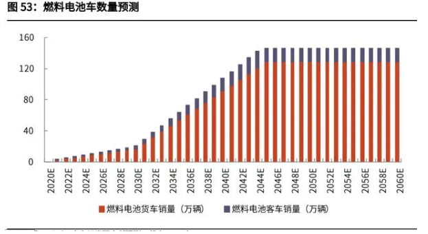 隨著電動車保有量的提升,假設(shè)車樁比在 2030 年達(dá)到 1:1,則 2060 年充電樁 總數(shù)將超過 5 億個。綜合考慮充電樁的新建需求和更換需求,累計新增投資達(dá)到 18.15 萬億元人民幣。氫能燃料電池將主要用于重型道路交通(客車、貨車)。假設(shè)輕型、中型、大型 貨車的年銷量保持在 150、20、70 萬輛,燃料電池滲透率在 2045 年達(dá)到 40%、 60%、80%,而后保持該滲透率;輕型、中型、大型客車的年銷量保持 30、7、 7 萬輛,燃料電池滲透率在 2045 年達(dá)到 30%、50%、70%,而后保持該滲透率, 則累計新增投資達(dá)到 29 萬億元人民幣。