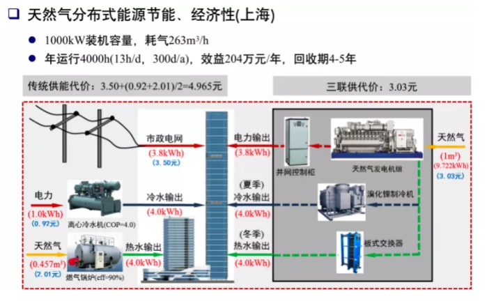 三聯(lián)供,1Nm3天然氣可發(fā)3.8kWh的電能,或差不多同等熱量或冷量。若天然氣能按3元/Nm3價(jià)格,折合三聯(lián)供系統(tǒng)發(fā)電成本就約等于市電價(jià)格0.78元/kWh(上海市的一般工商業(yè)峰谷電價(jià)的加權(quán)平衡價(jià)格約在0.75元/kWh左右),剩余的余熱可以制冷或供熱,這就成了項(xiàng)目比較確定的利潤(rùn);按0.7元/kWh的冷熱價(jià)格,280元/噸蒸汽的價(jià)格,經(jīng)濟(jì)效益是非常可觀的。