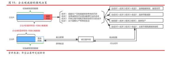 碳排放交易市場,是指將碳排放的權(quán)利作為一種資產(chǎn)標的,來進行公開交易的市場。也就是說,碳交易的核心是將環(huán)境“成本化”,借助市場力量將環(huán)境轉(zhuǎn)化為一種有償使用的生產(chǎn)要素,將碳排放權(quán)這種有價值的資產(chǎn)作為商品在市場上交易。至于碳市場的運行機制,首先,政府確定整體減排目標,采取配額制度,先在一級市場將初始碳排放權(quán)分配給納入交易體系的企業(yè),企業(yè)可以在二級市場自由交易這些碳排放權(quán)。其次,受到經(jīng)濟激勵、減排成本相對較低的企業(yè)會率先進行減排,并將多余的碳排放權(quán)賣給減排成本相對較高的企業(yè)并獲取額外收益。減排成本較高的企業(yè)則通過購買碳排放權(quán)來降低碳排放達標成本。按照華寶證券的分析,有效碳市場的碳排放權(quán)的價格就是企業(yè)的邊際減排成本。在企業(yè)微觀決策上,主要是將碳減排成本、超額碳排放成本、購買碳配額的成本與超額排放生產(chǎn)帶來的收益進行比較,并作出相應(yīng)決策。