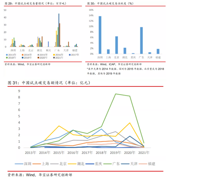 從價格上看,當(dāng)前,全球碳排放價格處于上升趨勢,各碳市場的碳價差別較大。據(jù)華寶證券,歐盟碳市場碳價最高,中國試點碳交易市場價格最低。華寶證券稱,我國試點碳價歷史最高點為122.97元/噸(深圳),最低點為1元/噸(重慶);歐盟EUA碳配額現(xiàn)貨碳價歷史最高點為47.91歐元/噸(折合人民幣約380元/噸),最低點為2.68歐元/噸(折合人民幣約22元/噸)。截止4月29日,我國碳試點碳價為 5.53-42.02元/噸之間(其中深圳碳市場碳價最低,為6.44元/噸,北京最高,為47.6元/噸),而同一天,歐盟EUA 碳配額現(xiàn)貨結(jié)算價為47.91歐元/噸(折合人民幣約380元/噸),為我國碳試點碳價的9-68倍。我國碳市場潛力多大?