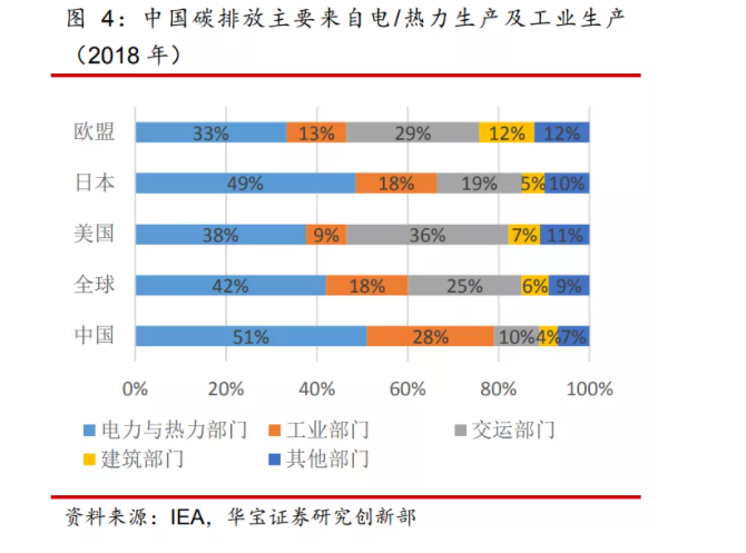 電熱力生產(chǎn)及工業(yè)集中用煤、交通領(lǐng)域大量耗油是導(dǎo)致中國碳排放量較大的主因。根據(jù)英國BP的2019年數(shù)據(jù),中國93%的碳排放來自于化石燃料的使用,其中68% 來自于固體燃料如煤炭,23%來自于液體燃料如石油等,9%來自于氣體燃料如天然氣等。