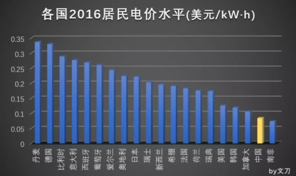 交叉補(bǔ)貼的形式有很多,工商業(yè)用電向居民用電的補(bǔ)貼就是其中一環(huán),也因此使得我國(guó)居民電價(jià)處于較低水平。世界上絕大多數(shù)國(guó)家居民電價(jià)高于工業(yè)電價(jià),居民電價(jià)為工業(yè)電價(jià)的1-3倍,平均約1.5倍左右,而我國(guó)的居民電價(jià)整體低于工商業(yè)電價(jià)。作為公用事業(yè)部門(mén)之一,電力行業(yè)有其公益屬性。出于社會(huì)穩(wěn)定的考慮,同時(shí)為了兼顧社會(huì)公平,實(shí)現(xiàn)電力普遍服務(wù),政府價(jià)格主管部門(mén)一方面會(huì)在地區(qū)之間、電壓等級(jí)之間調(diào)劑電價(jià),以降低欠發(fā)達(dá)地區(qū)、低電壓等級(jí)用戶(hù)的電費(fèi)負(fù)擔(dān);另一方面會(huì)居民和工商業(yè)之間調(diào)劑電價(jià),以降低居民生活用電價(jià)格。這就是交叉補(bǔ)貼的成因。電價(jià)中的交叉補(bǔ)貼并不是我國(guó)的特色。在電力行業(yè)的發(fā)展初期,世界各國(guó)大都曾存在過(guò)交叉補(bǔ)貼。整體來(lái)看,我國(guó)的電價(jià)水平,整體屬于中等略偏下。以2016年的數(shù)據(jù),采用美元為基準(zhǔn)進(jìn)行轉(zhuǎn)換后進(jìn)行比較。同時(shí),由于各地的電價(jià)數(shù)據(jù)形式不同,如豐枯季、分時(shí)電價(jià)等,所以只取了平均的電價(jià)水平。
