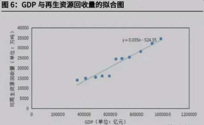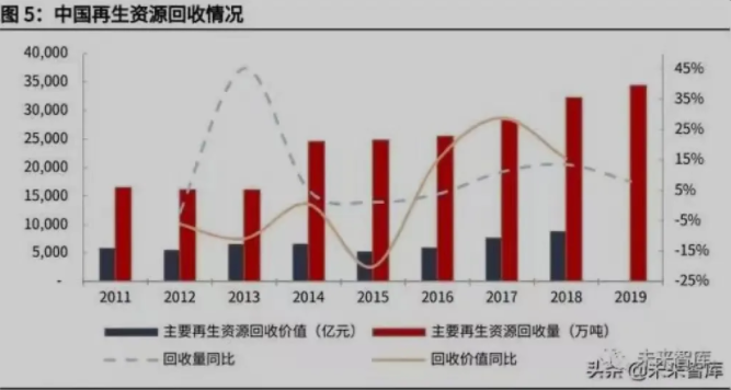 我國經濟發展與資源回收利用量之間高度相關。根據商務部流通業發展司發布的 《中國再生資源回收行業發展報告》和再生資源信息網的統計,2011-2018 年我 國主要再生回收價值從 5764 億元上升到 8705 億元,年均增長突破 6%;從總量上看,制造業、消費體量是 GDP 核心包含要素,這也恰恰是再生資源品的重 要來源。