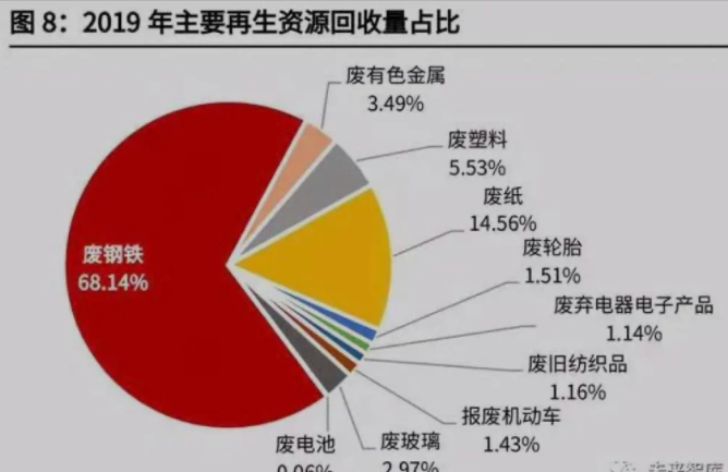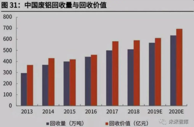 從再生資源回收結構上看,廢鋼、廢有色金屬(主要是廢鋁和廢銅)、廢紙、廢 塑料等無論是在回收量(合計占比超過 90%)上還是回收價值(合計占比超過 95%)上,均位列前四。以下將就這四類可再生資源的循環使用進行重點分析, 其中廢有色金屬將以廢鋁為例。
