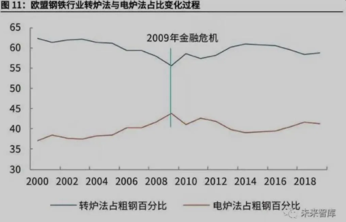 (3)采用以電爐短流程為主的生產方式,推動廢鋼的再利用,強化循環經濟。 從歐洲的經驗看,在碳約束增強或者碳成本直接對鋼廠利潤沖擊的時候,電爐短 流程的比重確實在提升。