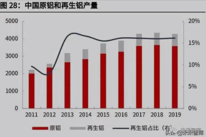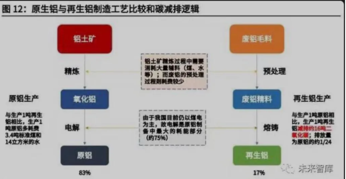 與鋼鐵行業不同,再生鋁的生產與原鋁生產之間的直接關聯并不大:廢鋁不可以 再用于電解鋁的生產,而是通過熔鑄成為再生鋁。