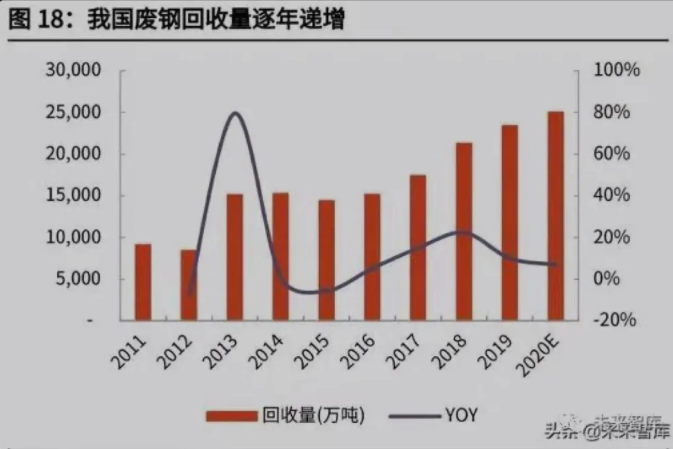 碳達峰、碳中和提出后,電爐(如果使用清潔能源)具有一定的減排效果,路線 低碳化轉變的過程中,會提升廢鋼的需求。