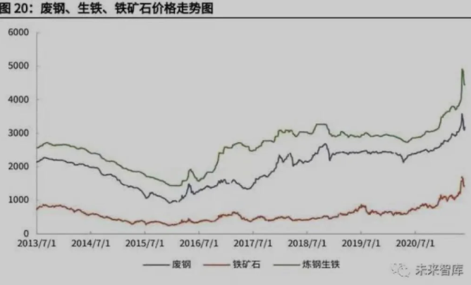 (3)在供給側:2015 年的中央經濟工作會議上,中央提出“三去一補一降”(去 產能、去庫存、去杠桿、降成本、補短板)五大任務,從 2016 年起,對鋼鐵行 業整體進行了供給側改革,拉動鋼價上漲,原材料價格也水漲船高。