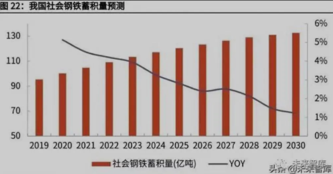 廢鋼的來源可分為折舊廢鋼(即日常生活里報廢器材中含有的鋼鐵)、鋼廠自產 廢鋼以及加工廢鋼。其中折舊廢鋼在廢鋼資源總量中所占的比例逐年增長,根據 中國工程院黑色金屬礦產資源強國戰略研究專題組的研究,折舊廢鋼可利用量可 以用社會鋼鐵蓄積量折算法得出,進而可以算出廢鋼資源總量。廢鋼產生率參考 美國、日本、俄羅斯等國的數據取 2.5%,2030 年社會鋼鐵蓄積量預測為 132.6 億噸,折舊廢鋼占比以 80%計,回收率以 90%考慮,則 2030 年社會廢鋼可利 用量將達到約 3 億噸。