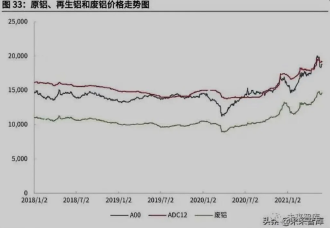 由于廢鋁不存在標準產品和全國性市場報價,這里選用中靈通網公布的廣東佛山 南海有色市場對破碎熟鋁(90%-92%)的報價作為廢鋁材料的市場價格。根據 我們的估算,中國廢鋁的市場價值在2019年達到約700億元。而在產品端ADC12鋁合金與 A00 鋁走勢趨于一致,多數情況下二者價差在 1000 元/噸之內;而 ADC12 則一般比廢鋁價格高出 4000-5000 元/噸。