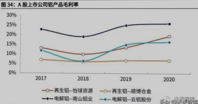 而通過比較 A 股上市的電解鋁和再生鋁制造企業具體到產品的毛利率,原鋁企 業的表現也整體更好,如作為原鋁制造龍頭之一的云鋁股份在鋁錠上的毛利率高 出順博合金 10 個百分點(2020 年數據)。