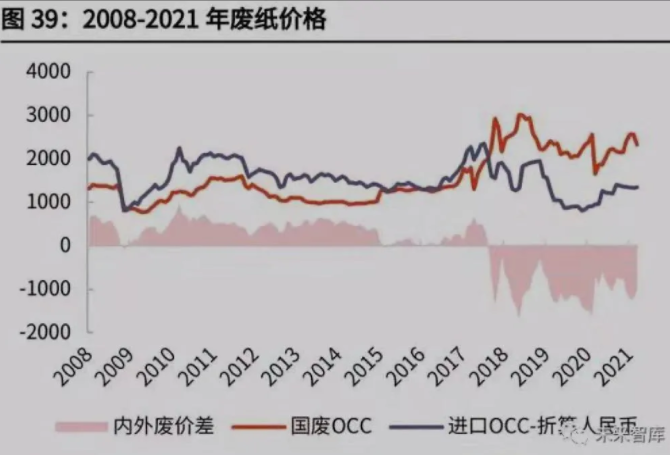 隨著“限廢令”的逐漸收緊,我國廢紙進口量大幅減少,國廢價格一路飆升。2018 年前我國的廢紙進口量基本在 2500-3000 萬噸,2018 年后開始大幅下降, 2019 年下降至 1000 萬噸,并有望于 2021 年下降至 0(根據《關于全面禁止進 口固體廢物有關事項的公告》要求,2021 年 1 月 1 日起禁止以任何方式進口固 體廢物)。隨著規模紙廠的廢紙庫存的耗盡,預計未來國廢價格將持續上升。