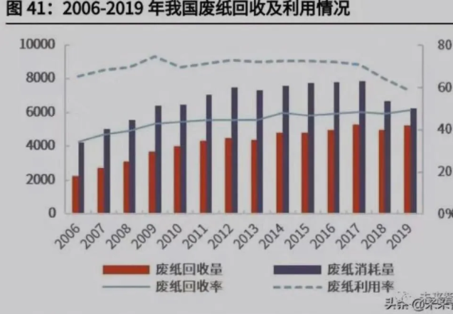 (1)垃圾分類、供給側改革政策疊加,有助于提升我國的廢紙回收率。隨 著限廢令的逐步趨嚴,國內廢紙原料供不應求,但我國廢紙回收率不足 50%, 仍存在較大的提高空間。垃圾分類、供給側改革政策疊加,有助于提升國內 的廢紙回收率,緩解國內廢紙短缺的情況,為廢紙類企業提供穩定的原材料, 降低企業對于美廢等進口廢紙的依賴,亦能提高國內對廢紙的定價權。