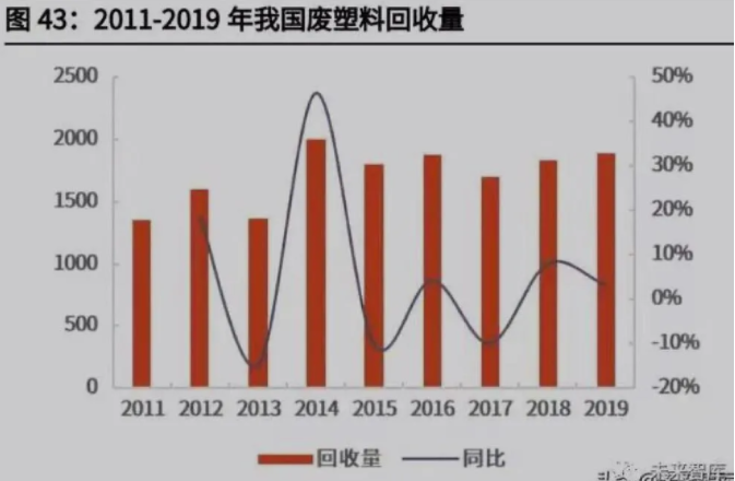 從循環再生階段來看,傳統產業鏈的再生廠商只是對廢塑料進行簡單物理回收, 無法得到用于食物和醫療等高質量領域的再生塑料。但禁止進口洋垃圾后,巨大 的供需缺口也促使提高我國回收技術,增加化學回收,生產高質量塑料,提高了 廢塑料的利用率。