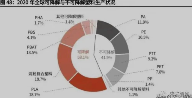 目前可降解塑料中占比前三的是淀粉復合塑料、PLA 和 PBAT,其中淀粉屬于天 然材料,性能缺陷很大,使用范圍非常受限,難以大規模應用,而 PLA 具有獨 特的硬度與透明度性能,PBAT 在軟質材料中最具成本優勢,這兩種材料將成為 未來可降解塑料中成長最快的品種。
