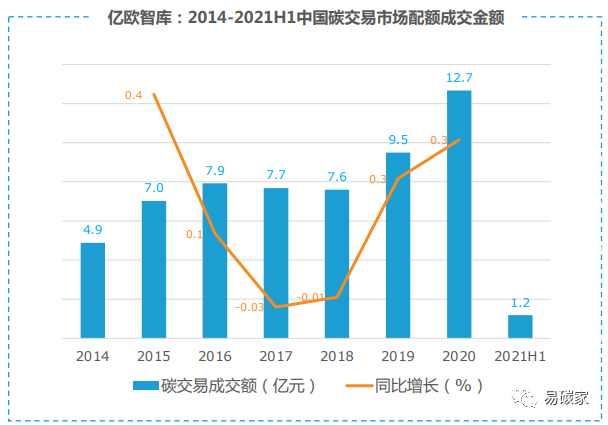 截至2021年上半年,自試點以來我國碳交易市場交易總額約為58.66億元。在交易額變化趨勢上,2014-2020年間,我國碳交易市場碳交易額整體呈現增長趨勢,2020年碳交易額達到新高,約為12.67億元。