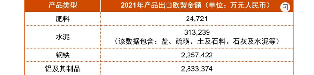 中國是歐盟重要的貿易伙伴與主要的產品進口來源國。據統計,2021年1-12月中國向歐盟出口產品共計人民幣33483億元,占全年出口貿易總額15.41%。2021全年涉及CBAM的四大類產品出口歐盟的金額占向歐盟出口總額不到2%。