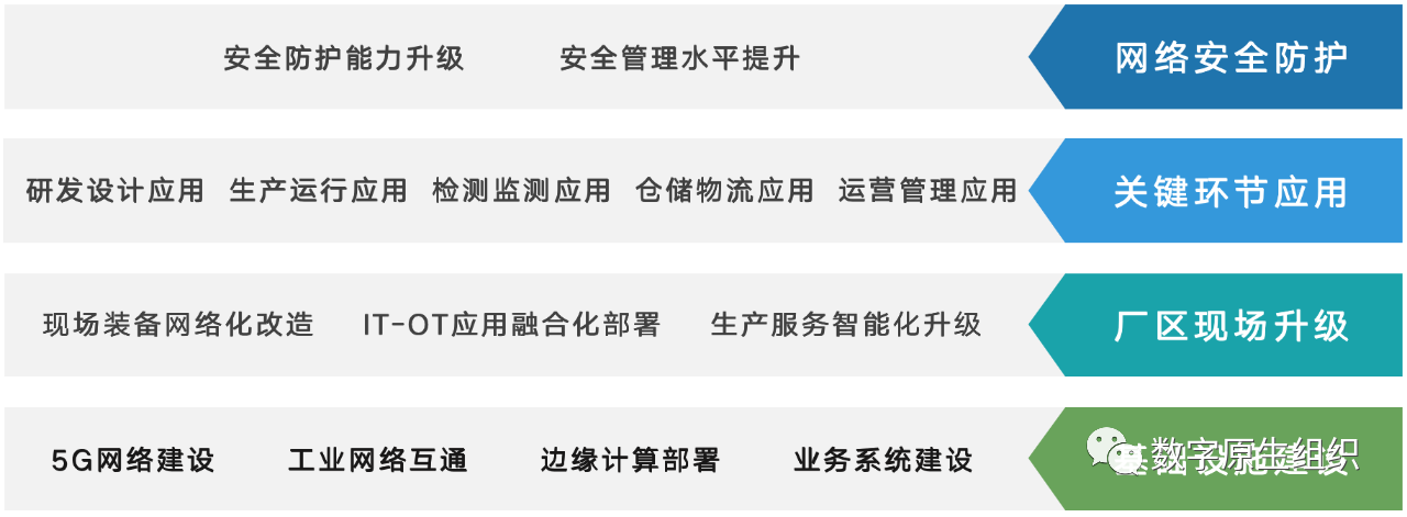 建設(shè)內(nèi)容包括基礎(chǔ)設(shè)施建設(shè)、廠區(qū)現(xiàn)場(chǎng)升級(jí)、關(guān)鍵環(huán)節(jié)應(yīng)用、網(wǎng)絡(luò)安全防護(hù)四個(gè)層面: