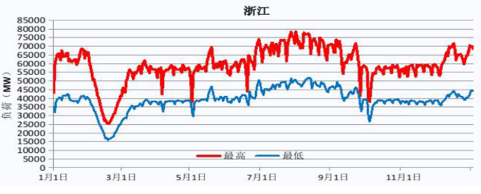 全年日最高、最低負(fù)荷曲線 | 用電最高 | 8月夏季最炎熱的時候用電量最高 |