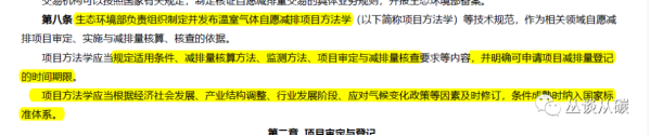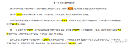 解讀:第八條,首先明確了方法學(xué)都是生環(huán)組織編寫,方法學(xué)規(guī)定適用條件、核算、監(jiān)測(cè)、審定核查要求,以及登記的時(shí)間期限。下圖是2012年發(fā)改版的管理辦法,提到了方法學(xué)的內(nèi)容,可以發(fā)現(xiàn)新版對(duì)方法學(xué)包含的內(nèi)容作出了更改——第一,沒有再明確額外性了,第二新加了審定核查要求,第三新增加了登記時(shí)間期限。