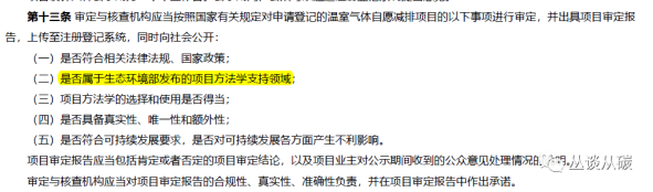 解讀:第十三條應(yīng)該跟第九條搭配看,跟征求意見稿對(duì)比,刪掉了“符合本辦法規(guī)定的項(xiàng)目范圍”,增加了“是否屬于生環(huán)發(fā)布的項(xiàng)目方法學(xué)支持領(lǐng)域”。這么看,刪掉上面幾個(gè)領(lǐng)域應(yīng)該意味著想要擴(kuò)大方法學(xué)的范圍,不要被原稿限定住了!