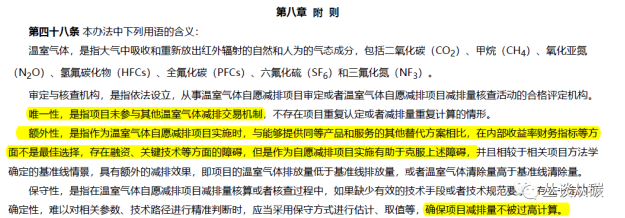 解讀:第四十八條,明確了唯一性是為參與其他減排機(jī)制,那么對(duì)于有些新能源項(xiàng)目跟綠電的申請(qǐng)或許要看具體的方法學(xué)中的審定核證要求了。額外性,提到收益率是必要考慮的指標(biāo)。保守性,無法精確時(shí),按少的減排量計(jì)算。