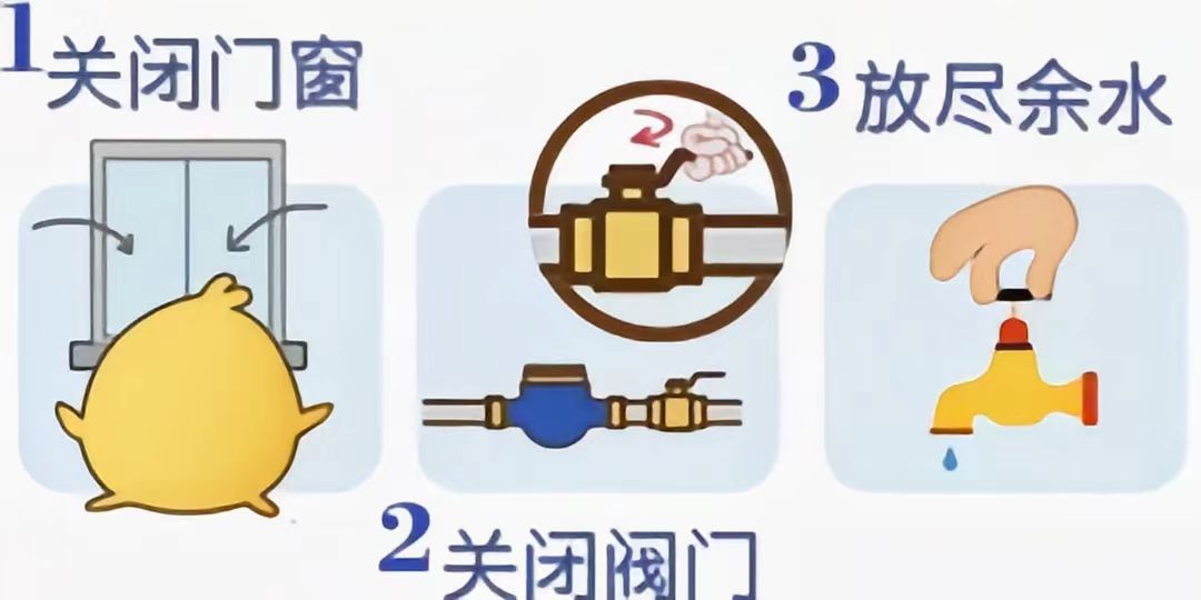 氣溫低于零攝氏度時,關(guān)閉鄰近用水設(shè)施的窗戶(特別是北側(cè)的門窗)及管道井門,保證室內(nèi)的溫度高于零度。