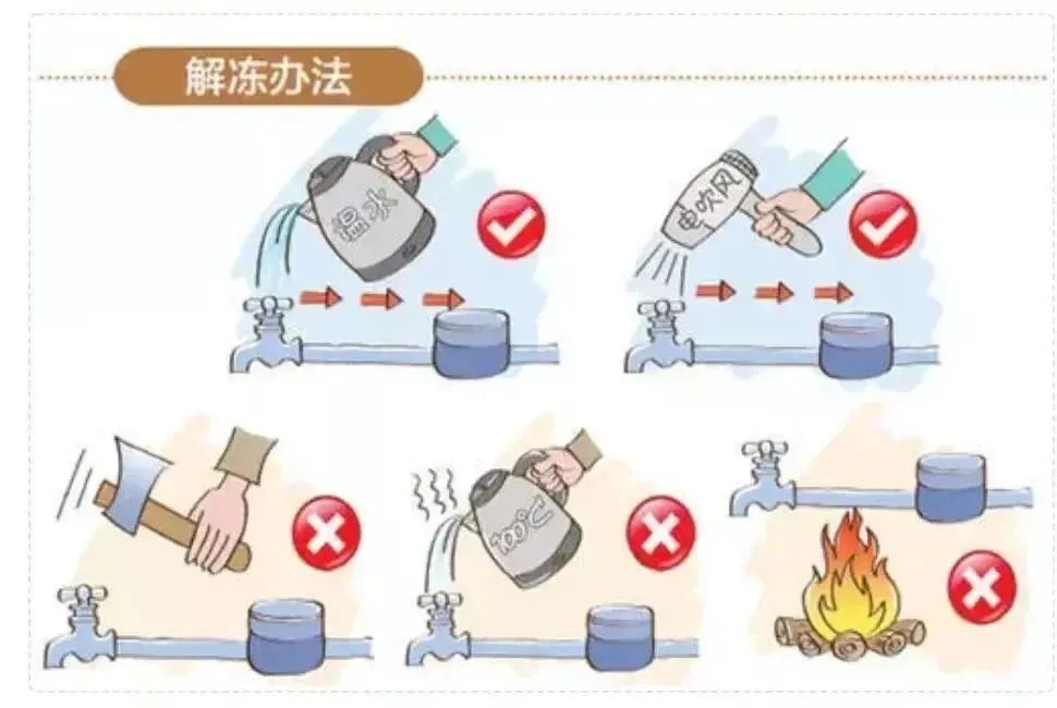 對已冰凍的水龍頭、水表、管道,請勿蠻力扳擰或用扳子、鉗子等工具硬性啟動,宜先用熱毛巾裹在水龍頭上,然后澆溫水,使水龍頭解凍,再擰開水龍頭,用溫水沿水龍頭慢慢向管道澆淋,使管道解凍。