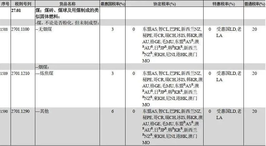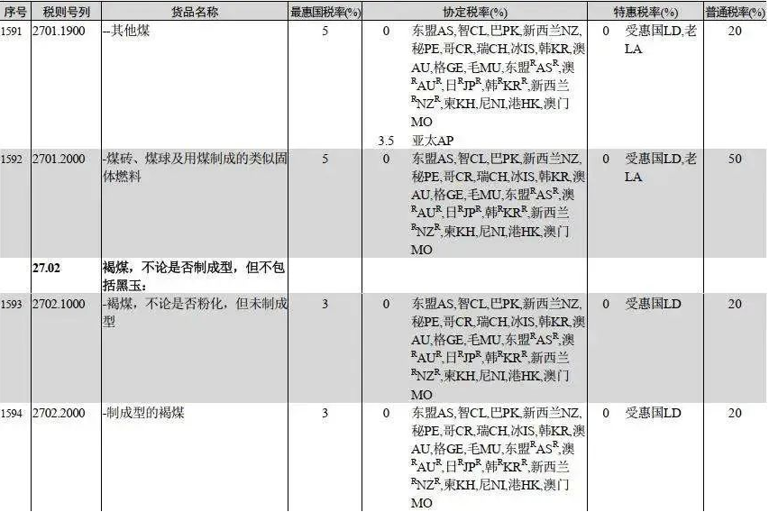 稅則顯示,2024年1月1日起,恢復(fù)煤炭進(jìn)口關(guān)稅。普通稅率為20%;特惠稅率為0;協(xié)定稅率基本為0;最惠國(guó)稅率中,無(wú)煙煤、煉焦煤、褐煤為3%,其他煤為6%。