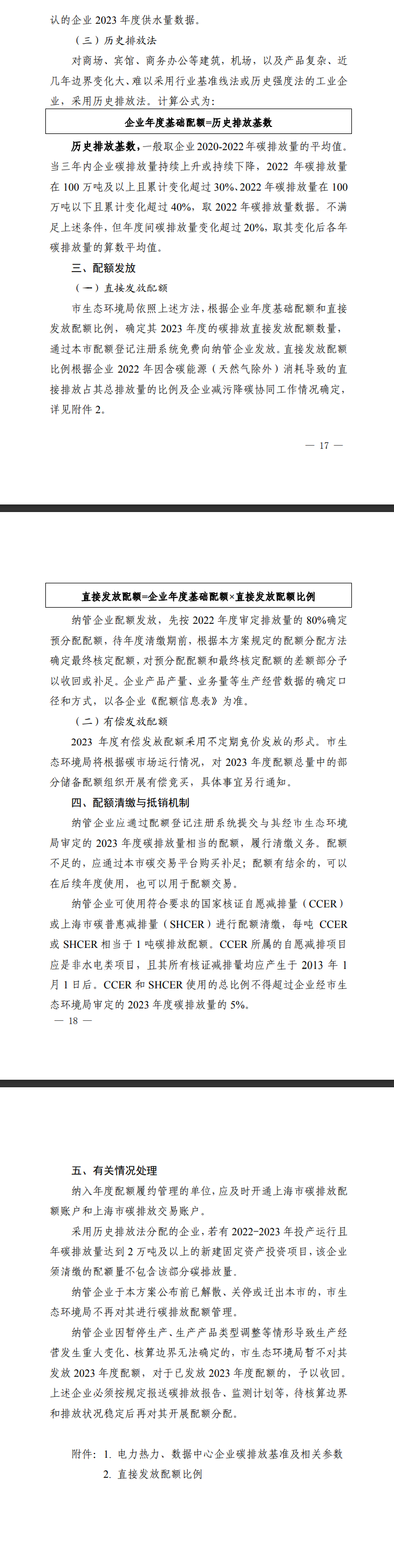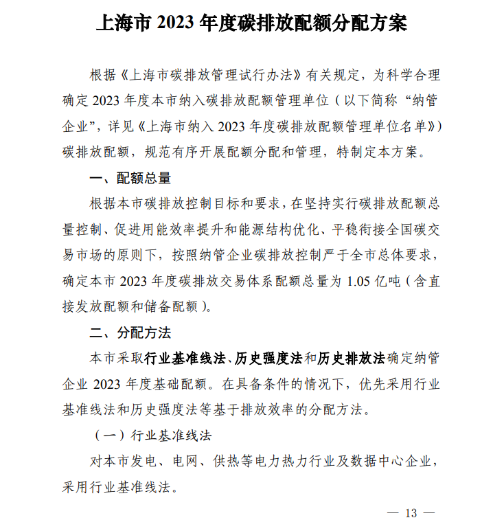 根據(jù)《上海市碳排放管理試行辦法》有關(guān)規(guī)定,我局?jǐn)M定了《上海市納入2023年度碳排放配額管理單位名單》和《上海市2023年度碳排放配額分配方案》,作為本市2023年度碳排放配額分配和管理等工作的依據(jù)。