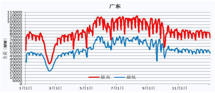 | 全年日最高、最低負(fù)荷曲線 | 用電最高 | 8月夏季最炎熱的時(shí)候用電量最高 |
