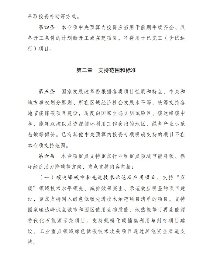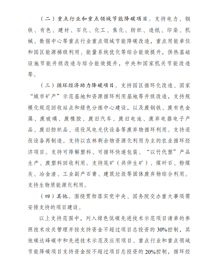 4月8日,國家發(fā)展改革委印發(fā)《節(jié)能降碳中央預(yù)算內(nèi)投資專項(xiàng)管理辦法》的通知。本專項(xiàng)重點(diǎn)支持重點(diǎn)行業(yè)和重點(diǎn)領(lǐng)域節(jié)能降碳、循環(huán)經(jīng)濟(jì)助力降碳等方向,重點(diǎn)支持內(nèi)容包括:碳達(dá)峰碳中和先進(jìn)技術(shù)示范及應(yīng)用項(xiàng)目等。支持國家碳達(dá)峰試點(diǎn)城市和園區(qū)使用生物質(zhì)能、地?zé)崮艿?/span>可再生能源替代化石能源示范項(xiàng)目。