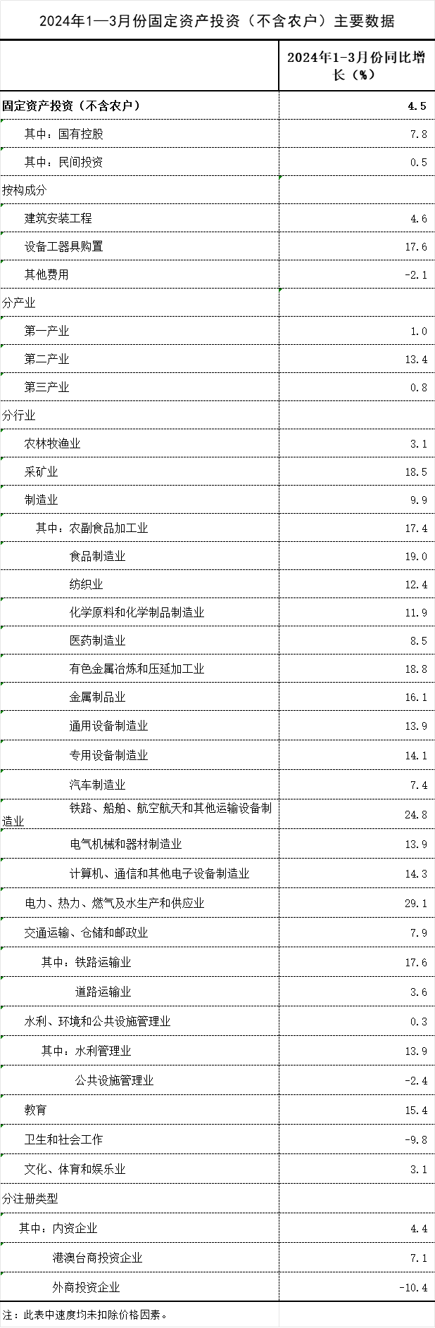 2024年1—3月份,全國(guó)固定資產(chǎn)投資(不含農(nóng)戶)100042億元,同比增長(zhǎng)4.5%(按可比口徑計(jì)算,詳見附注7),增速比1—2月份加快0.3個(gè)百分點(diǎn)。其中,制造業(yè)投資增長(zhǎng)9.9%,增速加快0.5個(gè)百分點(diǎn);基礎(chǔ)設(shè)施投資(不含電力、熱力、燃?xì)饧八a(chǎn)和供應(yīng)業(yè))增長(zhǎng)6.5%,增速加快0.2個(gè)百分點(diǎn)。從環(huán)比看,3月份固定資產(chǎn)投資(不含農(nóng)戶)增長(zhǎng)0.14%。2024年1—3月份,民間固定資產(chǎn)投資51597億元,同比增長(zhǎng)0.5%。