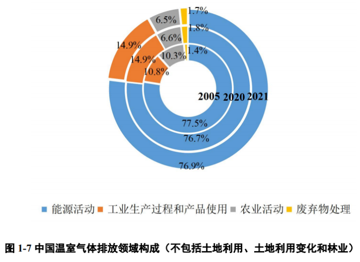 其中,能源活動溫室氣體排放為110.07億噸二氧化碳當(dāng)量,占比近76.9%;工業(yè)生產(chǎn)過程和產(chǎn)品使用溫室氣體排放為21.4億噸二氧化碳當(dāng)量,占比約14.95%。此兩項(xiàng)合計(jì)占比近92%。
