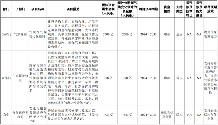 2023 年 12 月提交的《中華人民共和國氣候變化第四次國家信息通報(bào)》指出,中國 2021—2030 年減緩行動的年均資金需求規(guī)模約 2.0 萬億元;為實(shí)現(xiàn)碳中和目標(biāo),中國進(jìn)一步強(qiáng)化減緩行動,2021—2060 年減緩行動的年均資金需求規(guī)模約 6.5 萬億元;2021—2060 年適應(yīng)氣候變化資金年均需求 1.6 萬億元。