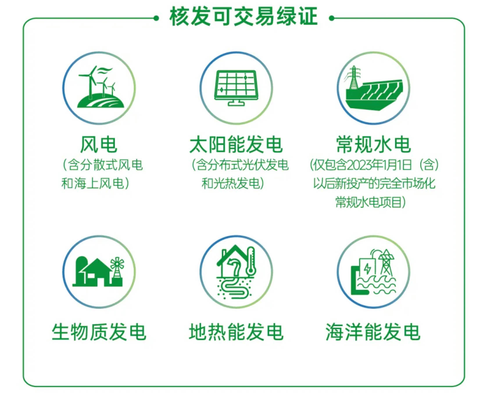 全國已建檔立卡的可再生能源發(fā)電項(xiàng)目所生產(chǎn)的全部電量,實(shí)現(xiàn)綠證核發(fā)全覆蓋。核發(fā)范圍如下圖所示: